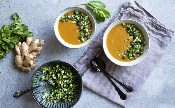 Blend all of the ingredients together until they are fine and smooth. Put in the fridge and let it cool for at least 2 hours. This dish needs to be served cold.