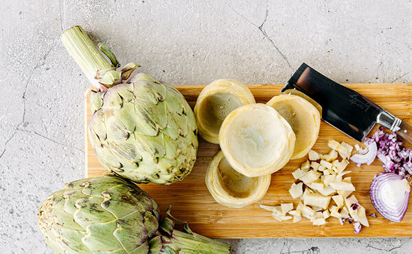 - Tag derefter en kniv og mos artiskokken på et skærebræt.