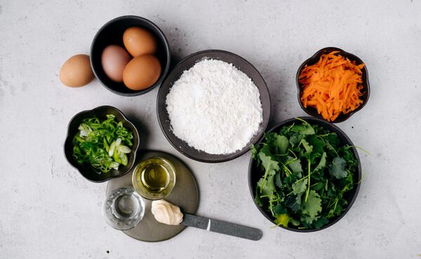 - Den geschnittenen Grünkohl, die Frühlingszwiebeln und die Möhre zum Teig geben (einiges als Topping für später aufbewahren).