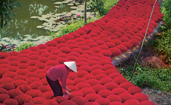 In Erwartung des Tet-Festes, dem Neujahrstag nach dem Mondkalender, verwandelt sich das Dorf Quang Phu Cau in der Nähe von Hanoi jedes Jahr in ein rosa Farbenmeer. An diesem Feiertag bieten gläubige Vietnamesen Millionen von Räucherstäbchen als Opfergaben dar, sowohl in den buddhistischen Tempeln des Landes als auch am heimischen Ahnenaltar. Viele davon werden in Quang Phu Cau gefertigt.Für die Arbeiter ist das Räucherwerk ‚Herzensarbeit‘ – das Herz spielt dabei eine ebenso große Rolle wie die Fertigkeit der Hände. Schon seit Menschengedenken werden die Räucherstäbchen in dem Dorf hergestellt, und seine Bewohner arbeiten noch immer nach der traditionellen Methode.Diese Technik wird ‚Spalten des unteren Bambusstabs‘ genannt. Dabei wird die Bambusrinde auf die passende Länge zugeschnitten, in Wasser eingeweicht, geschält und solange in zwei Hälften gespaltet, bis die Stäbchen 3 mm dünn sind. Anschließend werden sie nass gemacht und erneut getrocknet, damit sie leichter brennen. Die Unterseite der Stäbchen wird in attraktivem Rosa gefärbt, bevor sie erneut an der Sonne getrocknet werden. Als nächstes werden sie mit einer Räucherpaste umhüllt, die aus der klebrigen pulverisierten Rinde des O Duoc-Baums und einem aromatischen Pulver aus Adlerholz, Eukalyptus und Zimt hergestellt wird. Die Stäbchen werden darin gerollt, bis sie rundum mit der Räuchermischung bedeckt sind, und dann ein letztes Mal getrocknet.