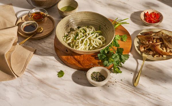 - Make the noodle sauce by blending the coriander (save a little for presentation) with the tahini, miso, soy sauce, lime zest and juice, and mirin in a blender (or use your hand blender). Pour the noodle sauce onto the noodles and add the cucumber strips to the bowl. Stir well.