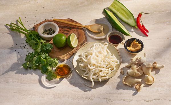 - Transfer the noodles into a beautiful large bowl and arrange the oyster mushrooms on top. Finish with the furikake, red pepper, a few drops of pure sesame oil, and some extra coriander.