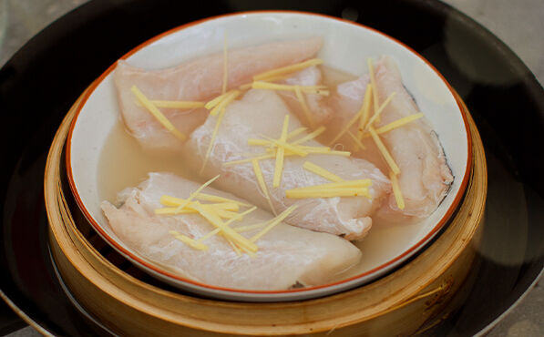 Coloque os quatro lombos de peixe numa tigela que encaixe no cesto de vapor. Regue o peixe com a água e o vinho de Jerez e, depois, com uma colher de sopa de gengibre. Feche bem o cesto de vapor e coloque-o numa panela grande com água a ferver. Deixe cozinhar a vapor durante 6 minutos. Não se esqueça de introduzir mais água quando vir que o nível desceu.