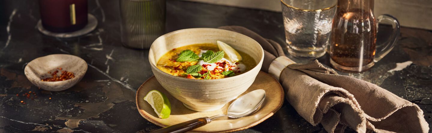 - Kontrollera att bönorna är mjuka. Servera kitcharin i en skål med chili-ghee, kokosyoghurt, lime och några myntablad.